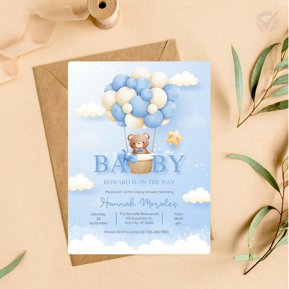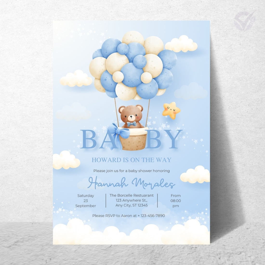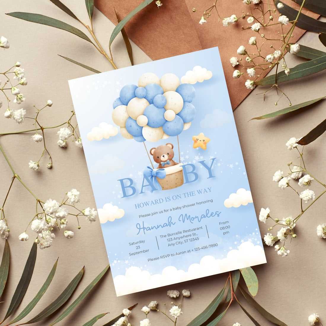 Featuring soft clouds, floating balloons, and pastel tones, this invitation is perfect for whimsical baby showers — whether you're planning a gender-neutral event, a hot air balloon theme, or a sky-inspired celebration.
