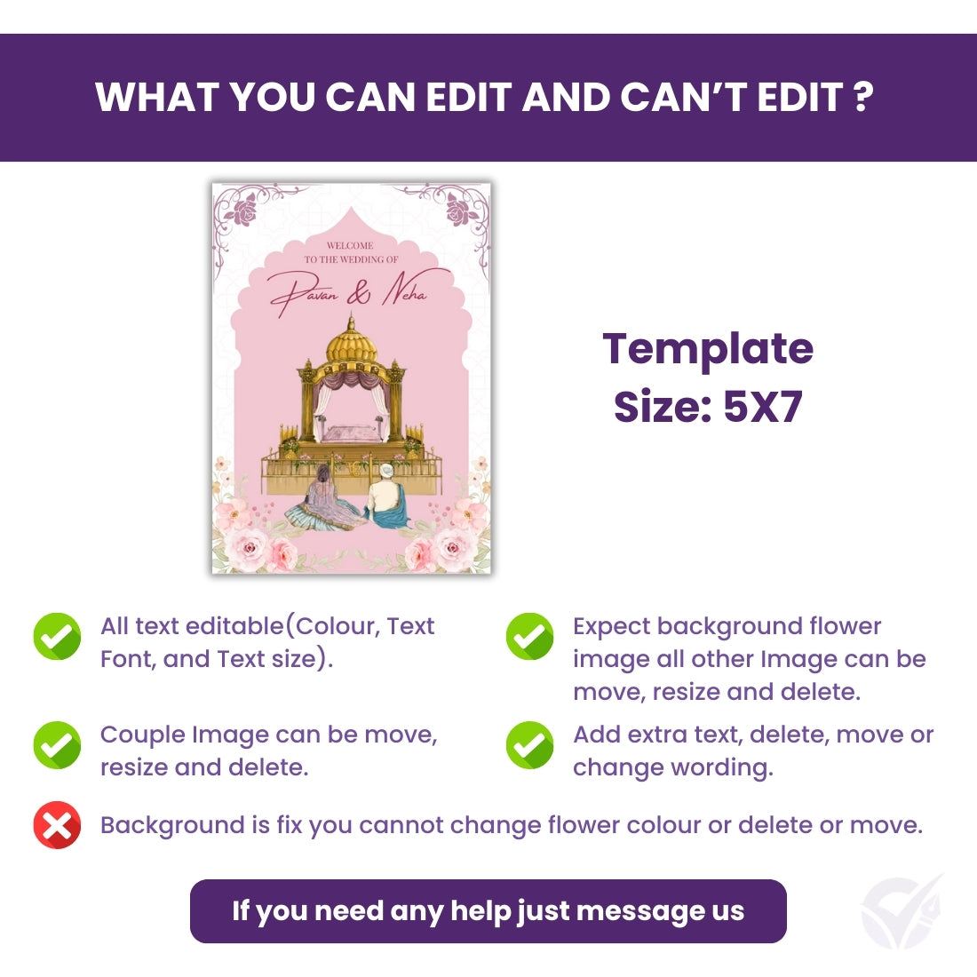 From a unique front card featuring a traditional Punjabi couple illustration to reception and RSVP cards, every page is designed to reflect love, heritage, and sophistication. All templates are editable in Canva – so you can personalize your text, fonts, and colors effortlessly.