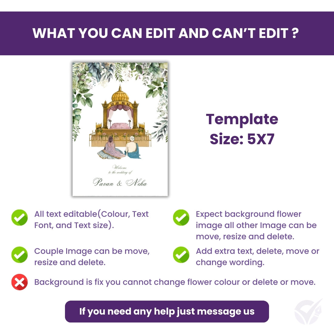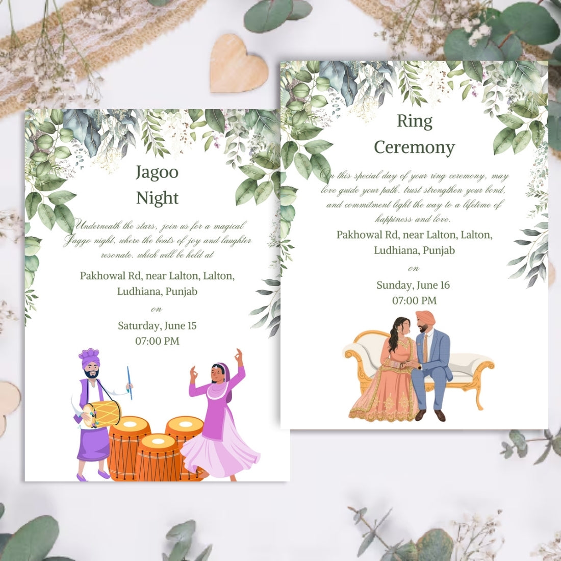 Each card is thoughtfully crafted to reflect the essence of Sikh traditions, with hand-drawn-style illustrations that add charm and character to every invite. Whether you’re sharing via WhatsApp, email, or printing for delivery, this digital-only template set ensures your wedding feels memorable and truly personal.