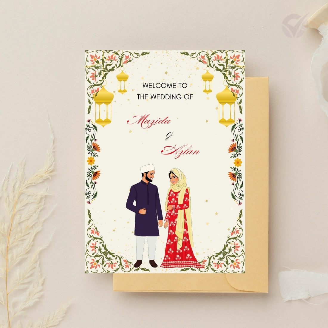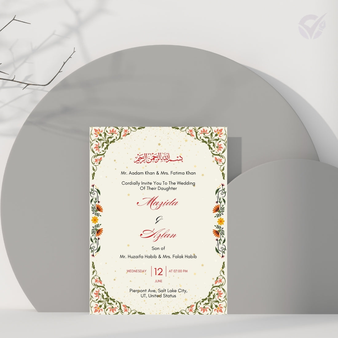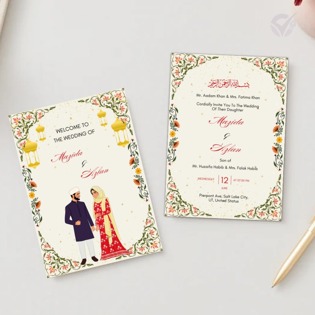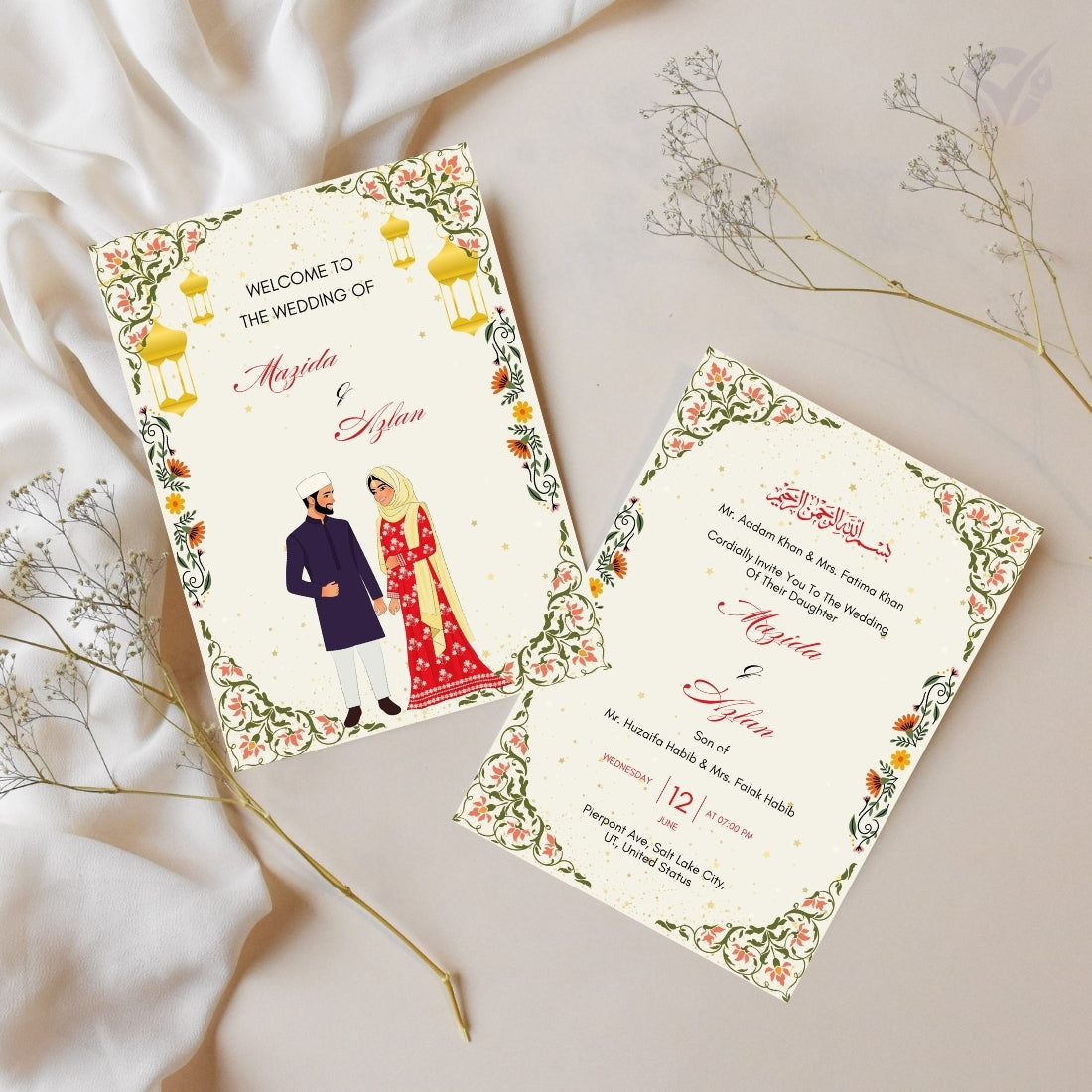 A stunning introductory card featuring the couple’s names, adorned with Islamic design elements like arches, crescent moons, floral patterns, or optional Bismillah in Arabic calligraphy. A beautiful first impression that carries meaning and elegance. -
