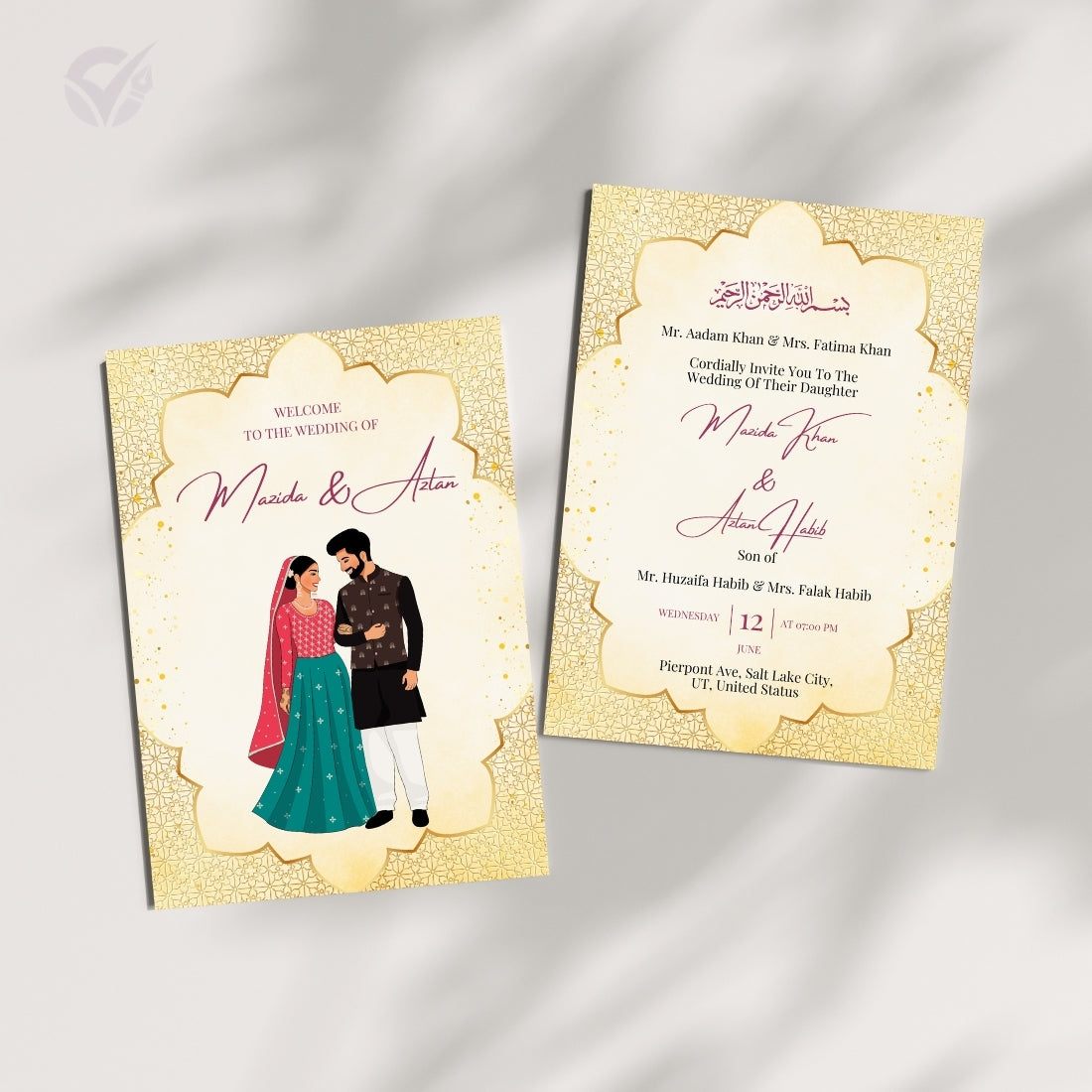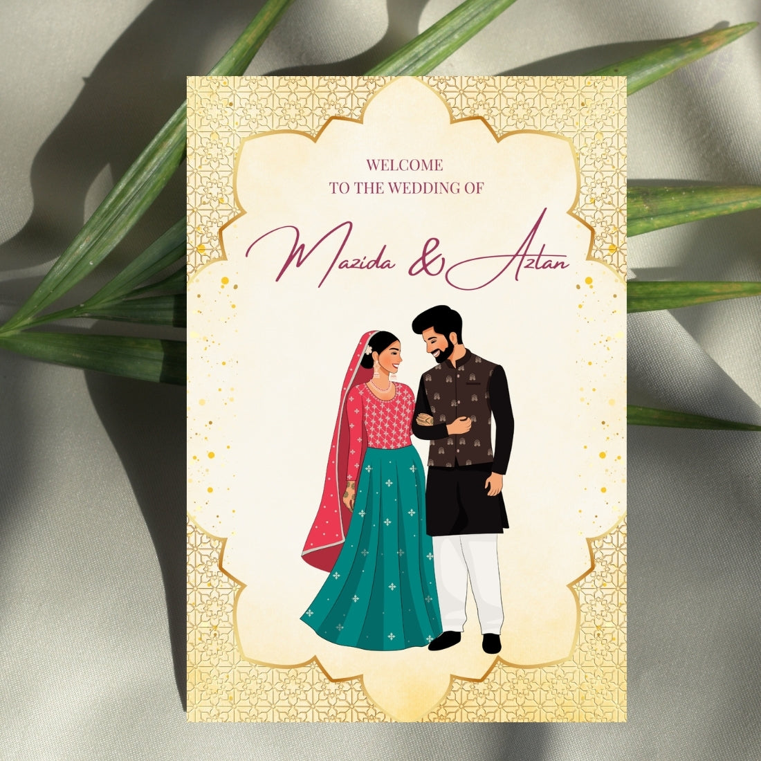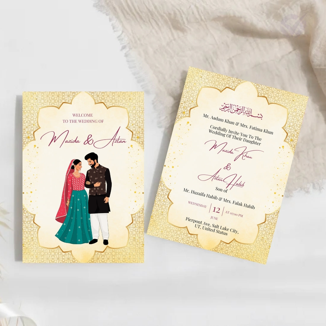 A beautifully framed intro card featuring the names of the bride and groom, adorned with Islamic motifs such as arches, crescents, or florals. Optional space for Bismillah or a meaningful Quranic verse . -