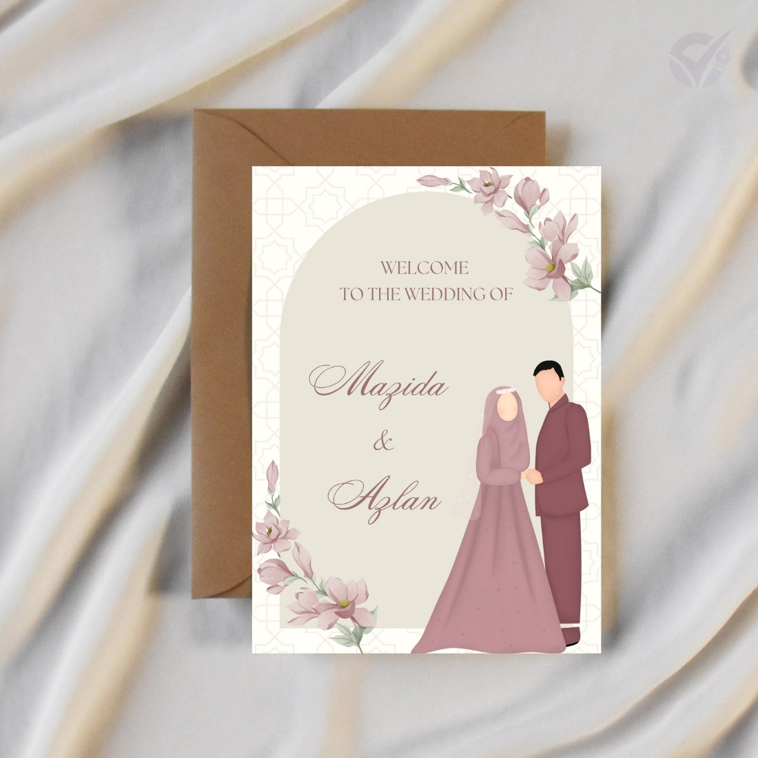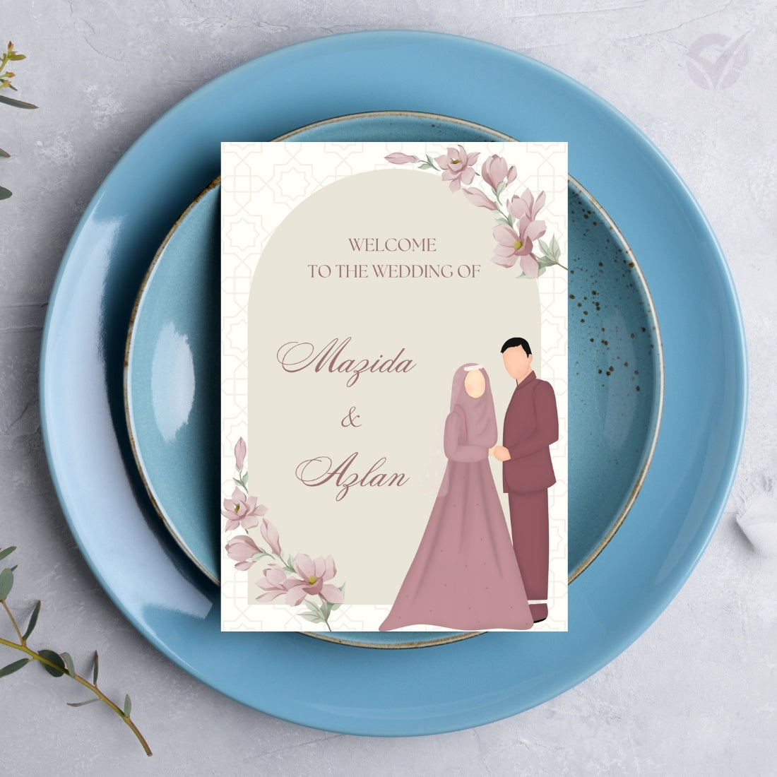 A beautifully framed name card with elegant Islamic elements like crescent moons, arches, or optional Bismillah or Quranic verse. A warm and spiritual introduction to your wedding announcement. -