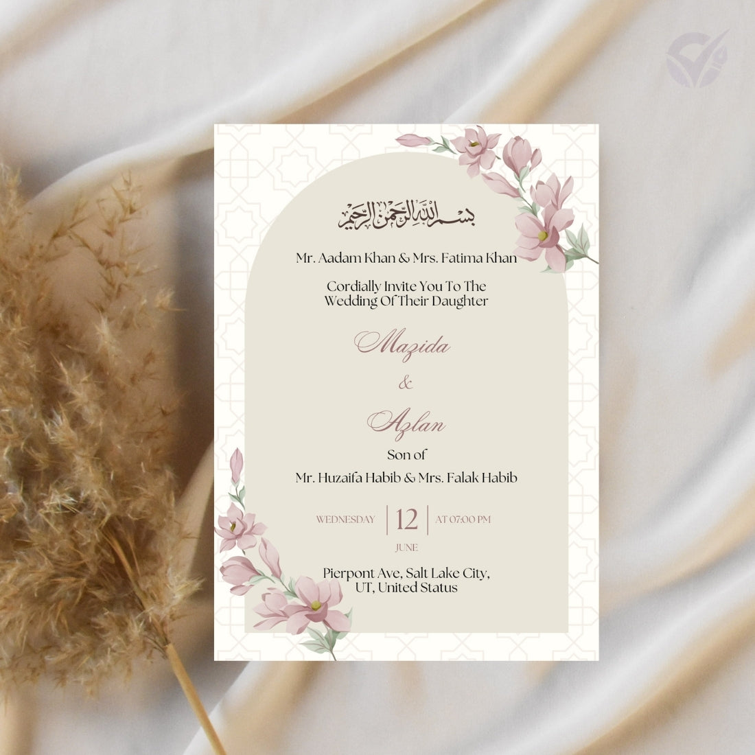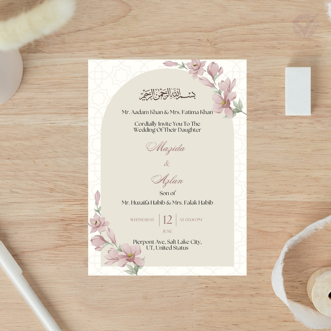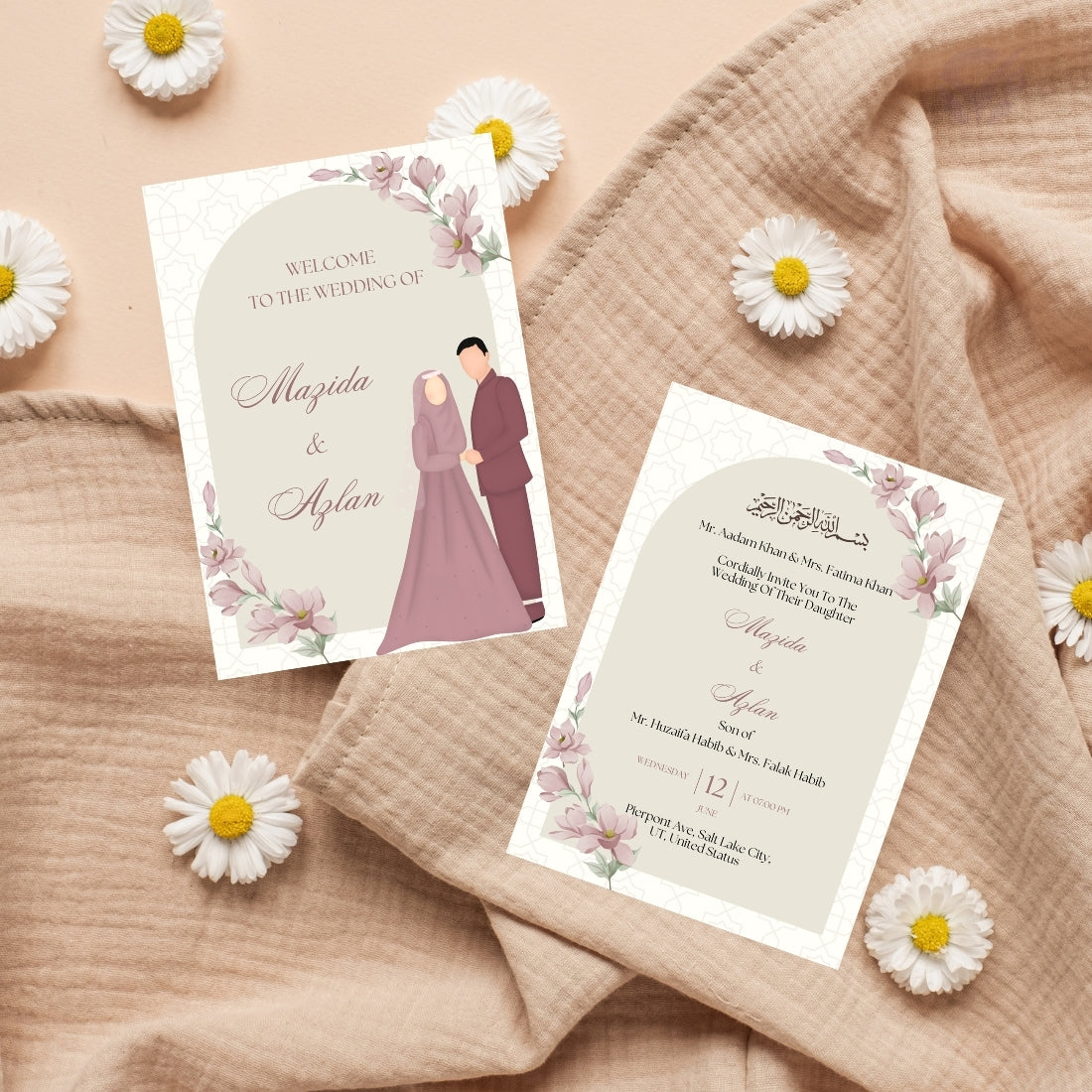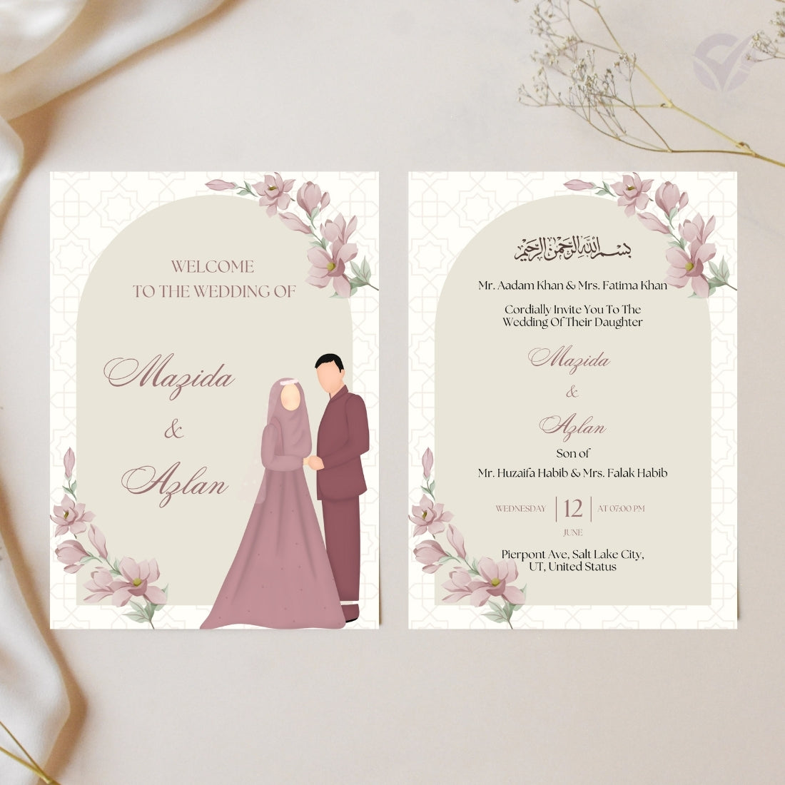 Make your wedding announcement as graceful and spiritual as your ceremony with this elegant 2-page Muslim Wedding Invitation Card set. This Canva-editable template blends Islamic tradition with modern minimalism — perfect for couples seeking beauty, simplicity, and full personalization.
