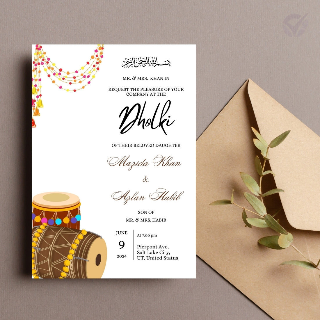 Dholki Invitation – Vibrant layout with musical elements and traditional charm
