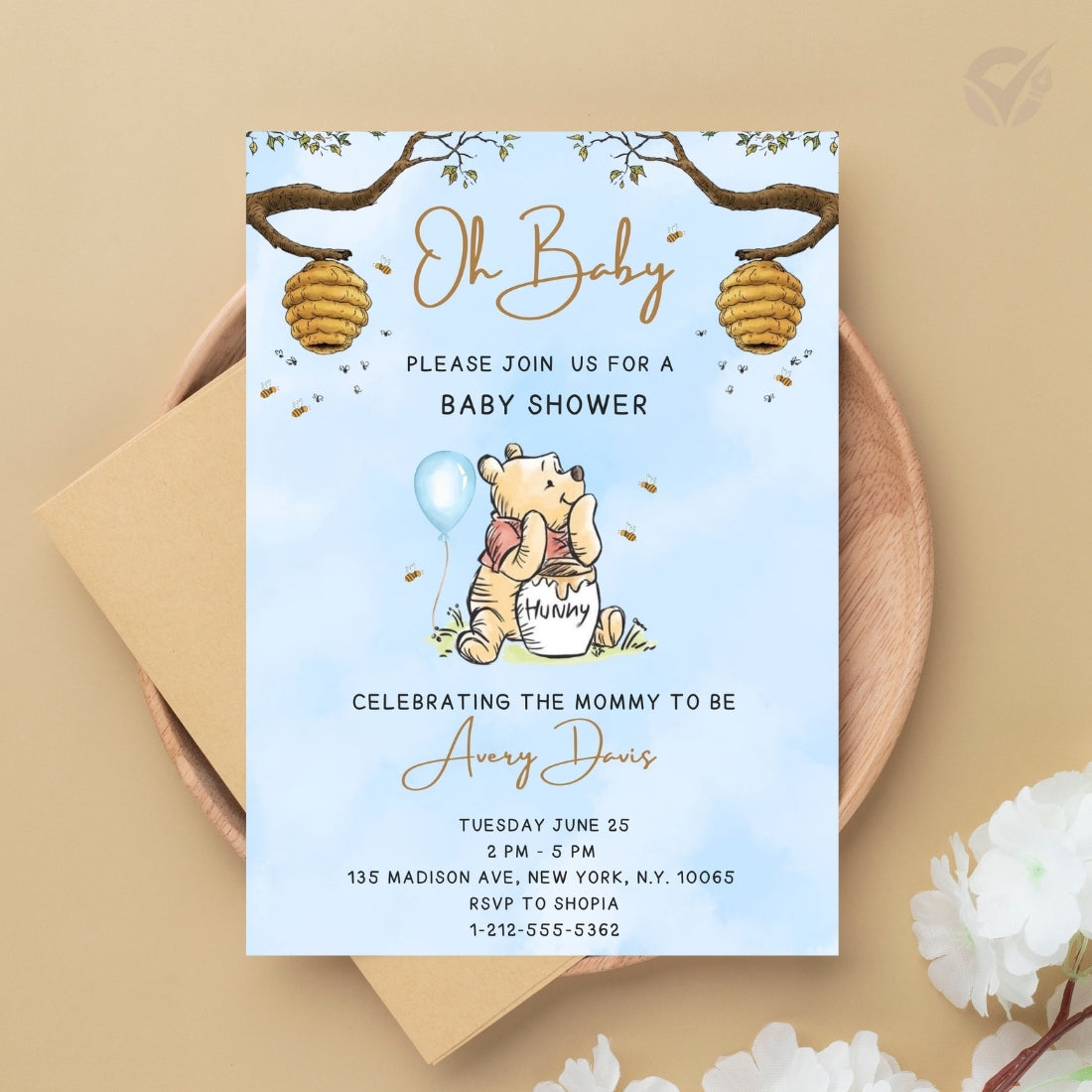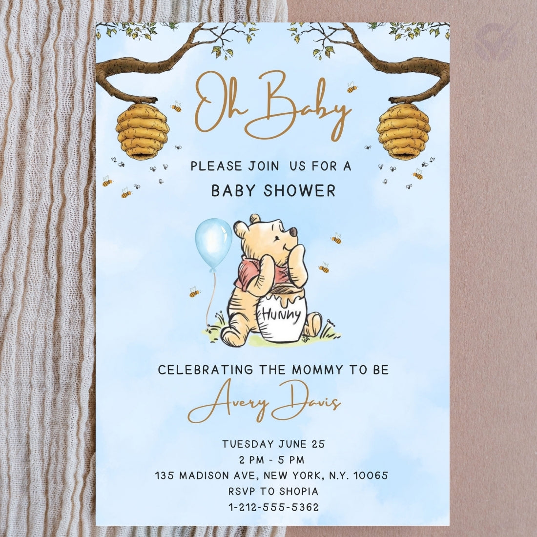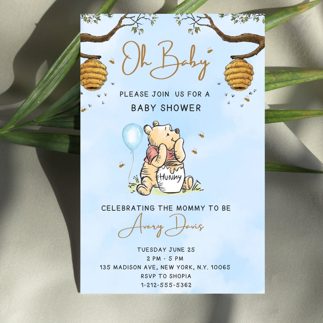Oh Baby Winnie the Pooh Baby Shower Invitation Editable Canva Template Classic Pooh Bear Baby Shower Invite Instant Digital Download