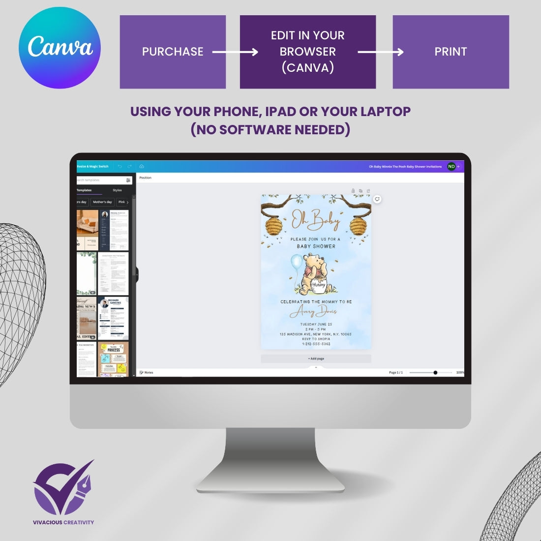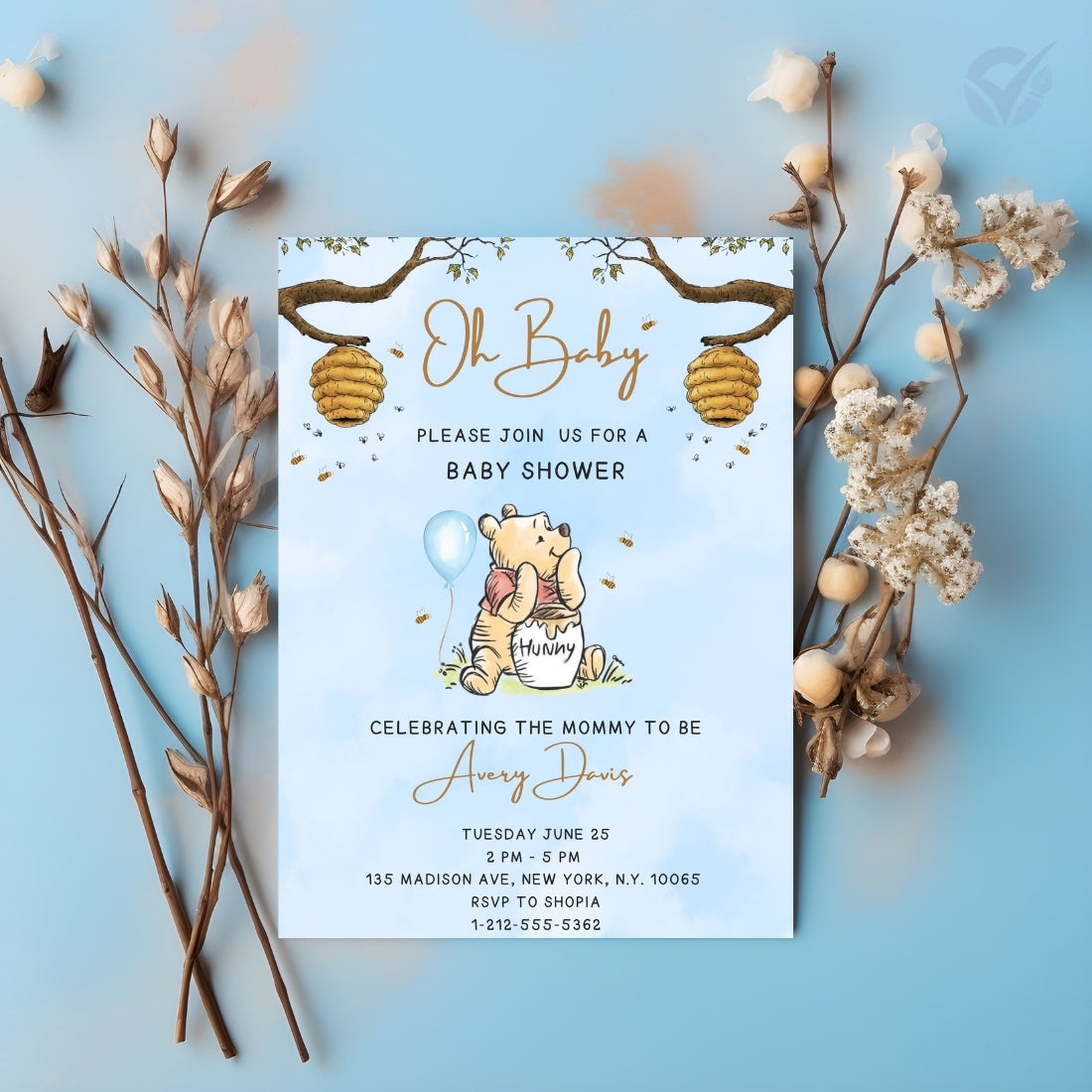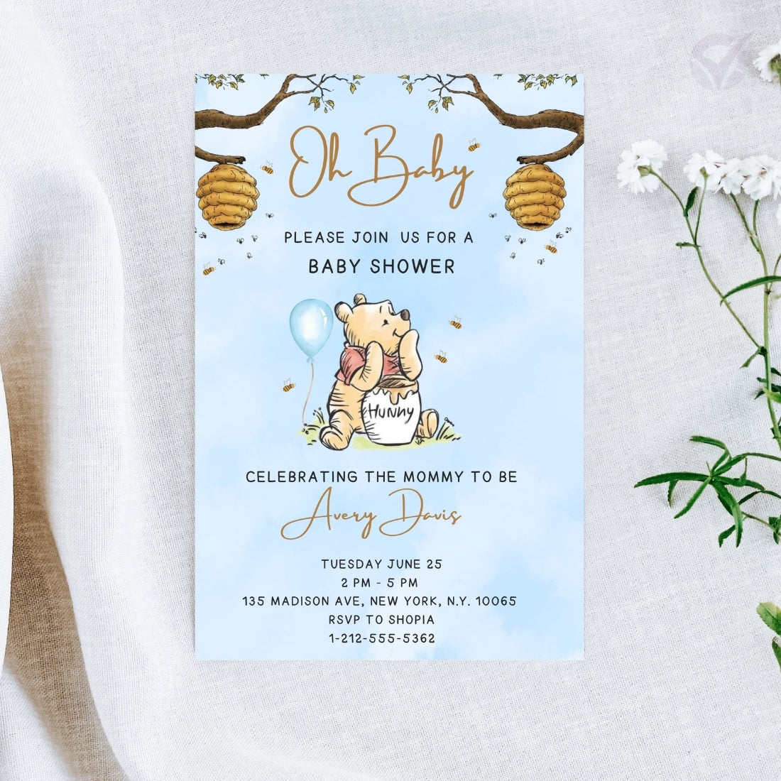 Oh Baby Winnie the Pooh Baby Shower Invitation Editable Canva Template Classic Pooh Bear Baby Shower Invite Instant Digital Download