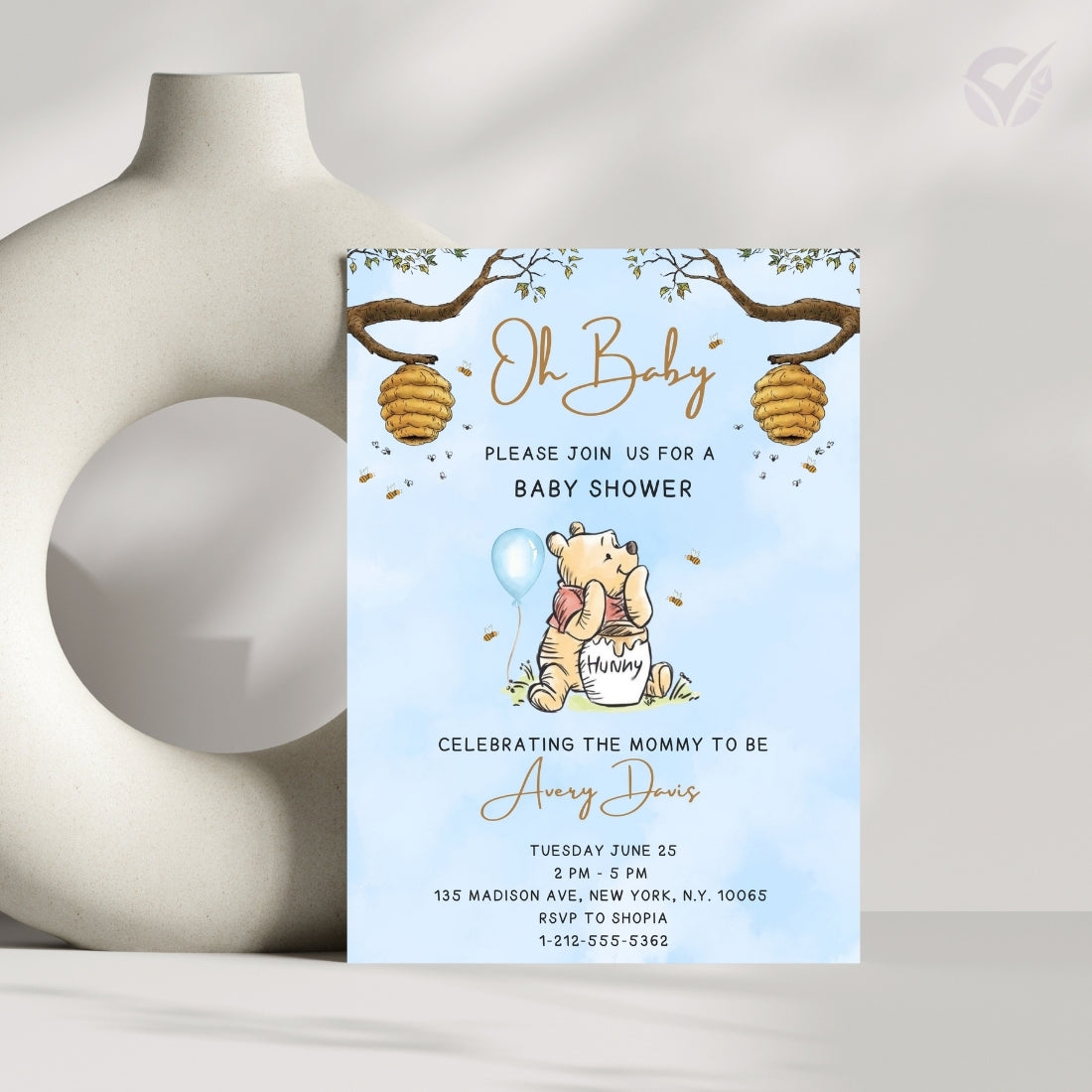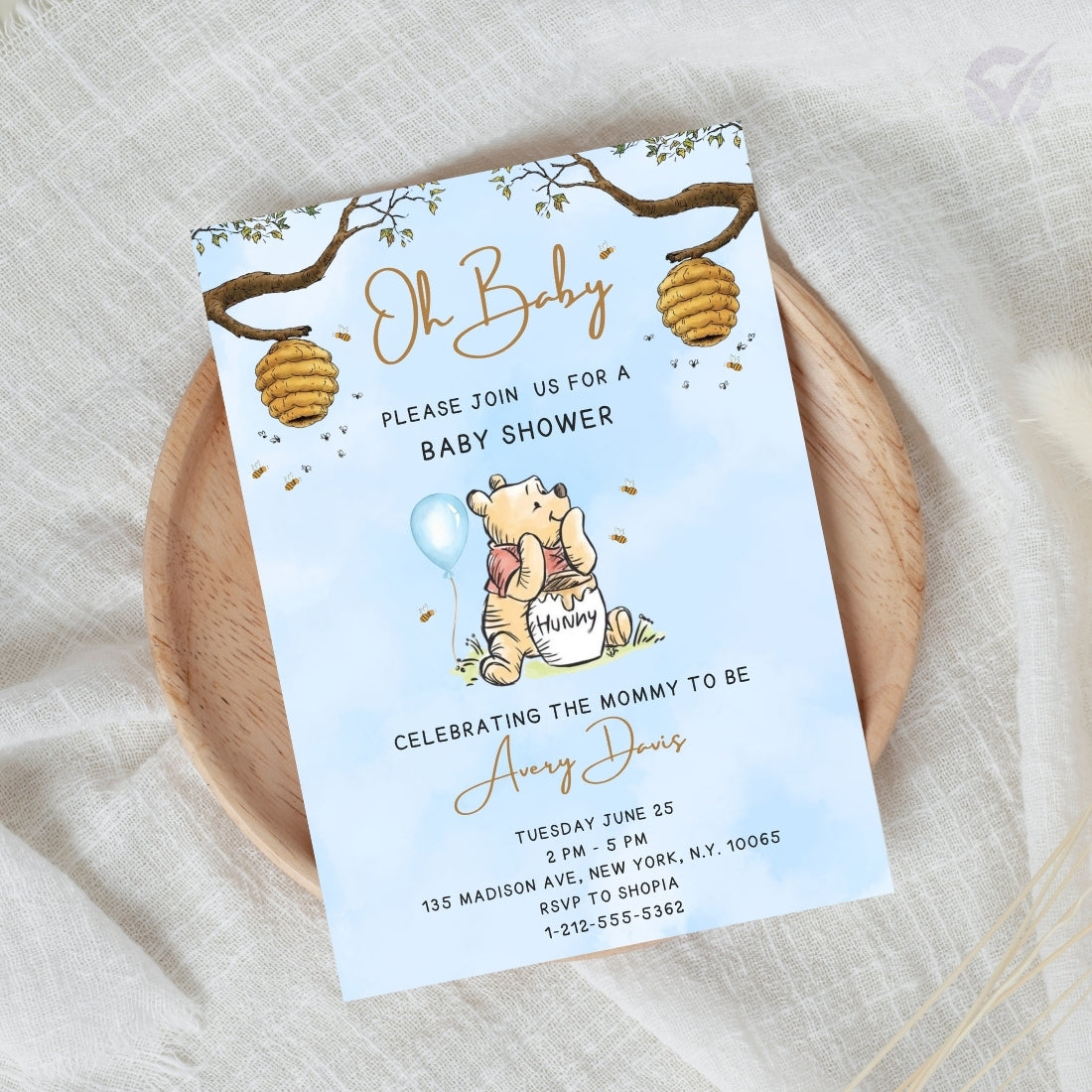 Celebrate your little one's arrival with this adorable Oh Baby Winnie the Pooh Baby Shower Invitation!