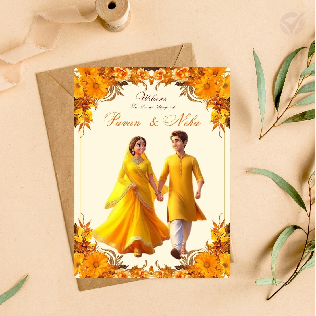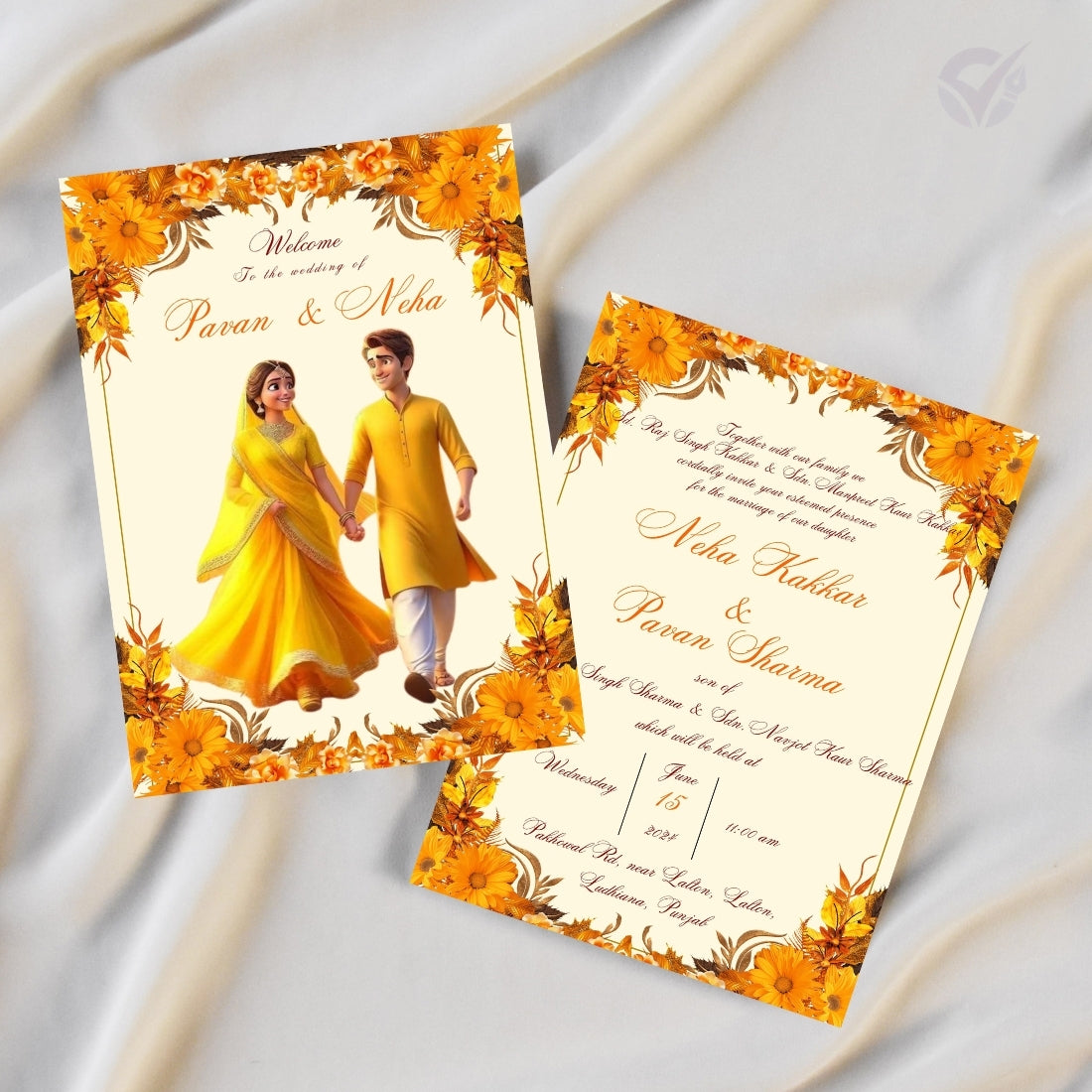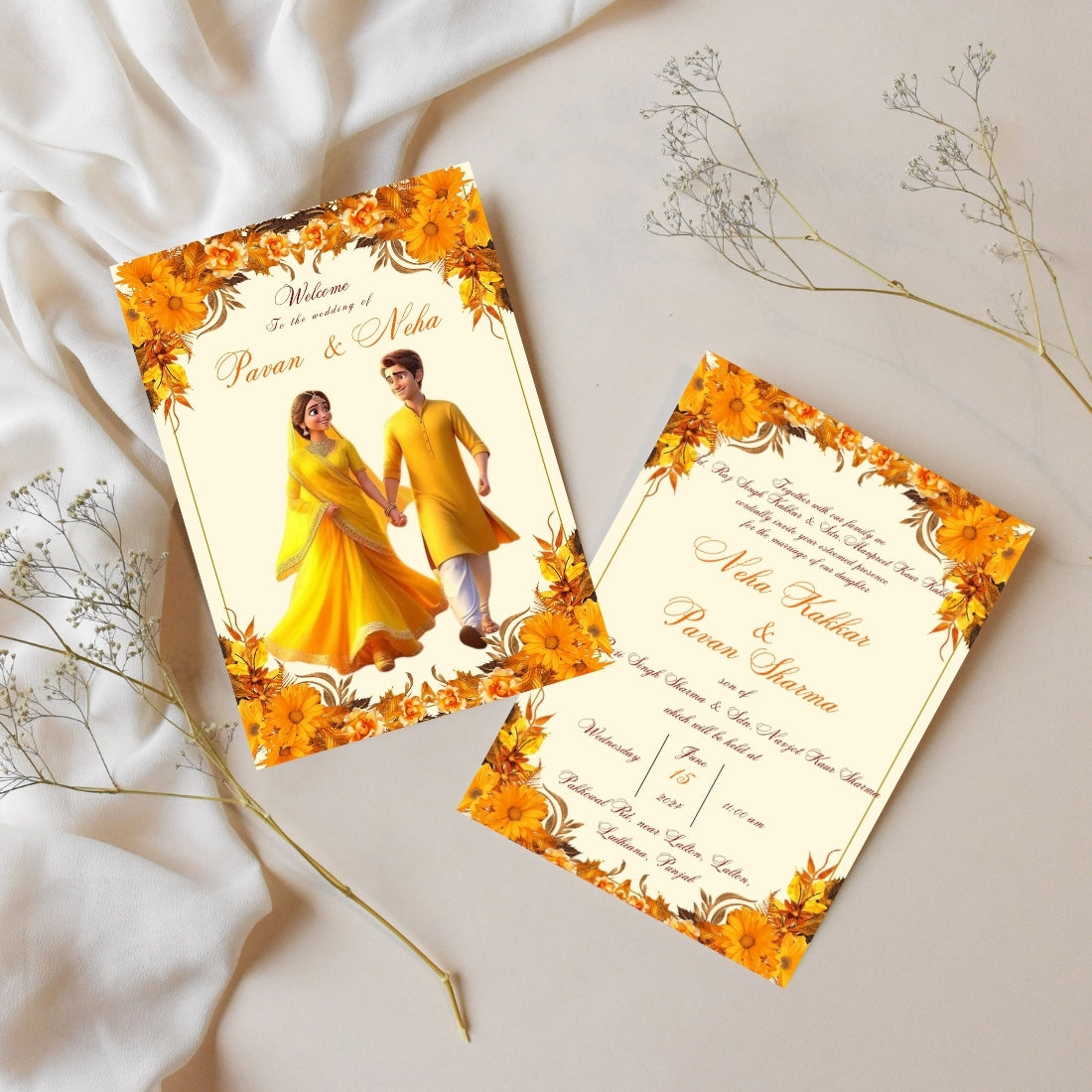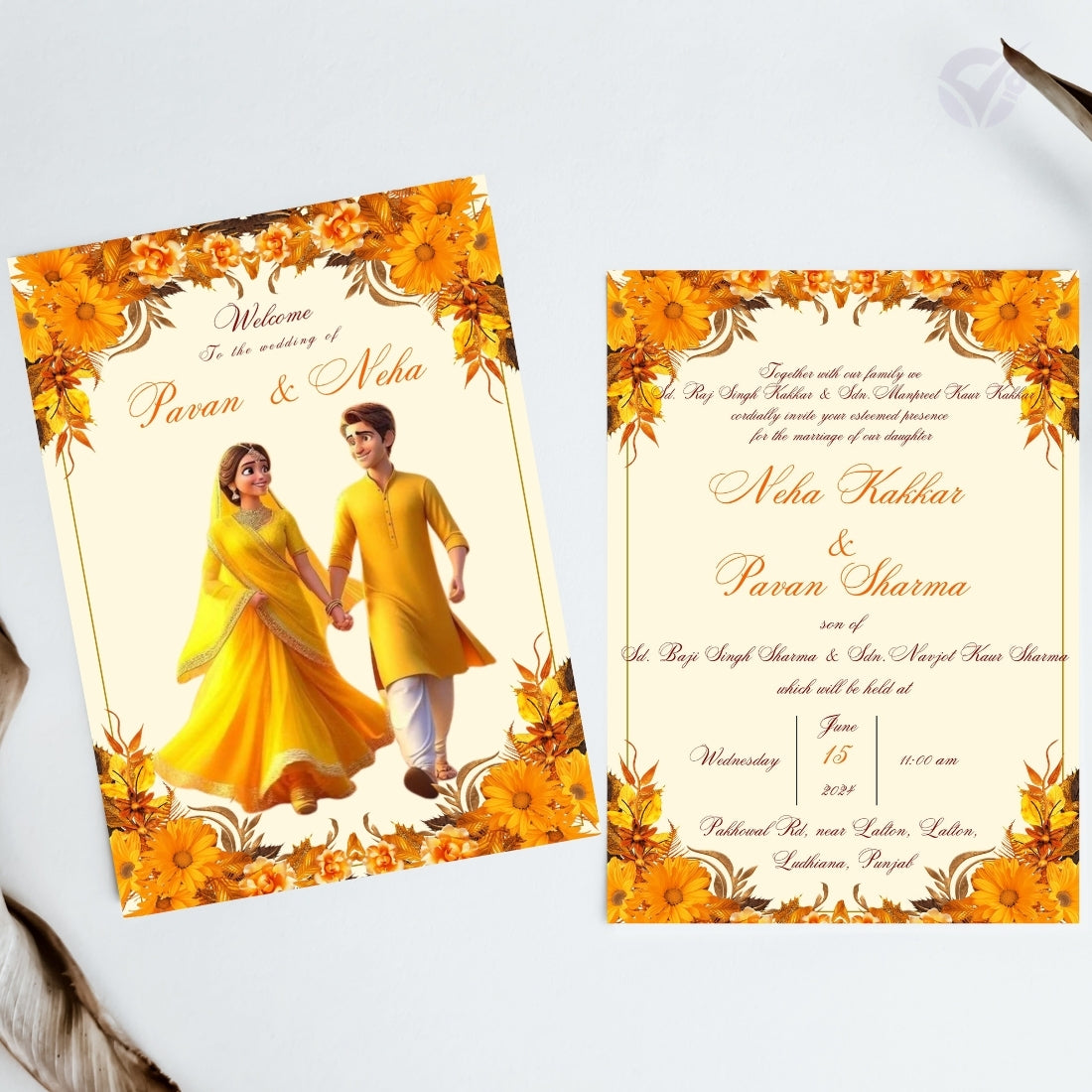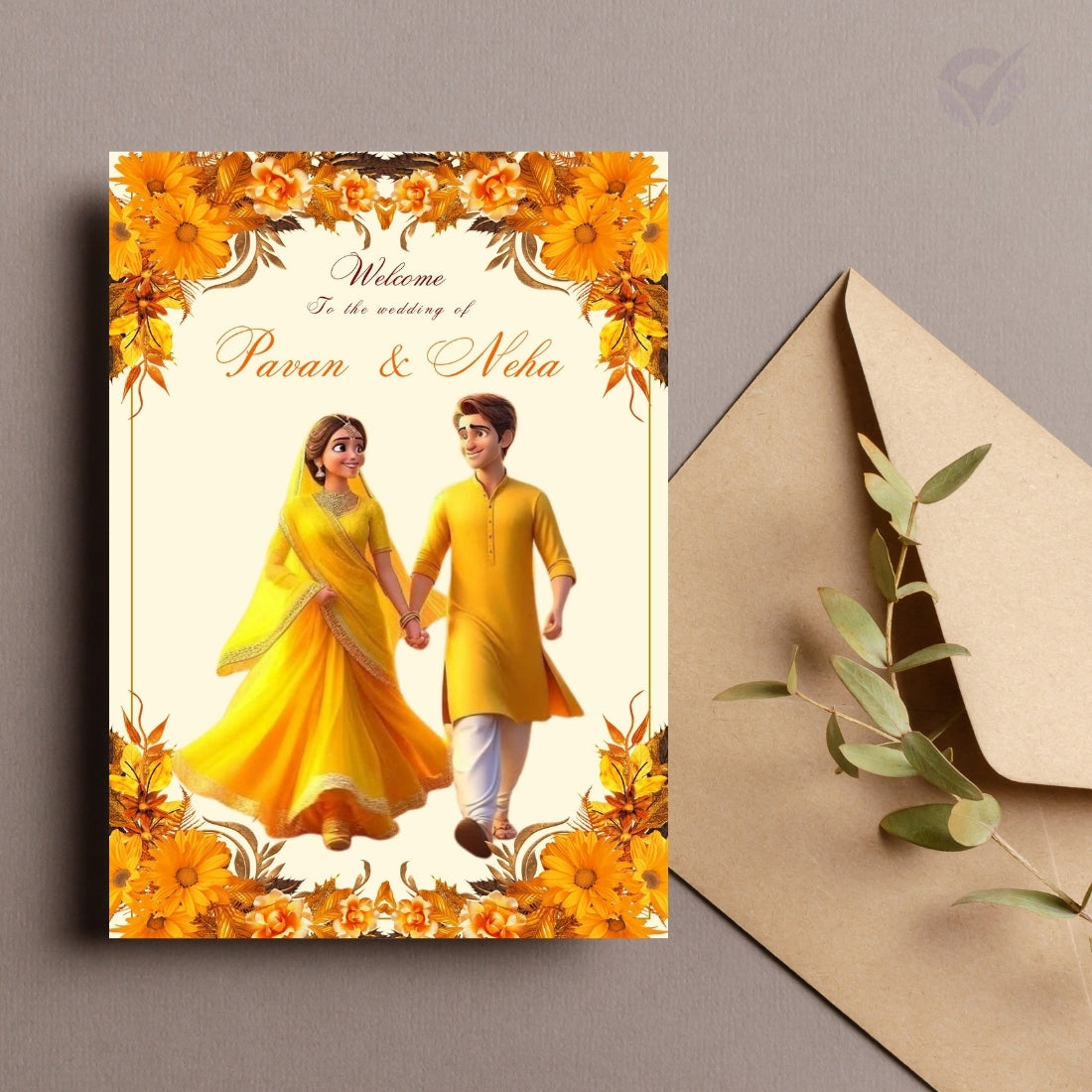 Card 1: Couple Name Card with a unique Punjabi couple illustration – perfect for a royal welcome.