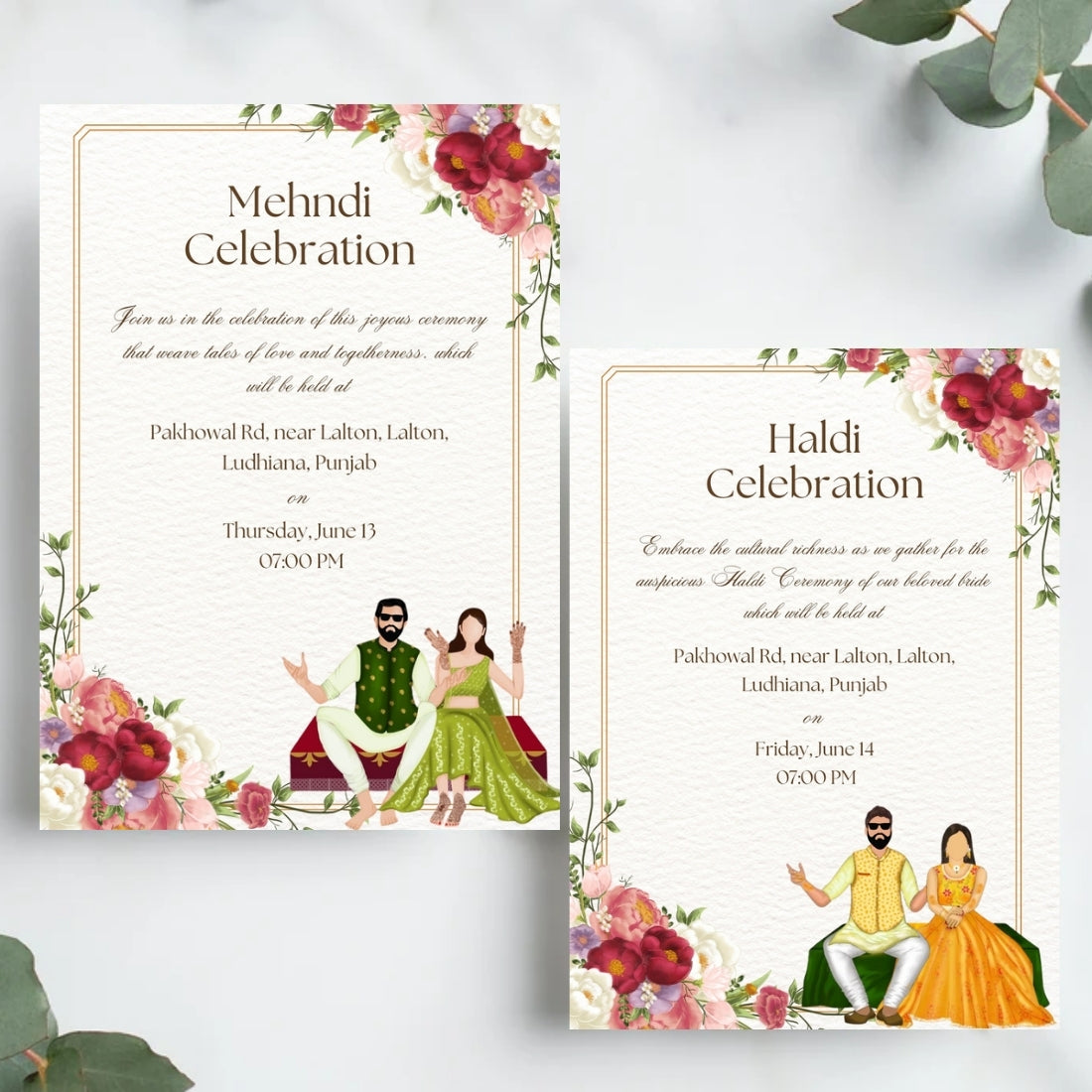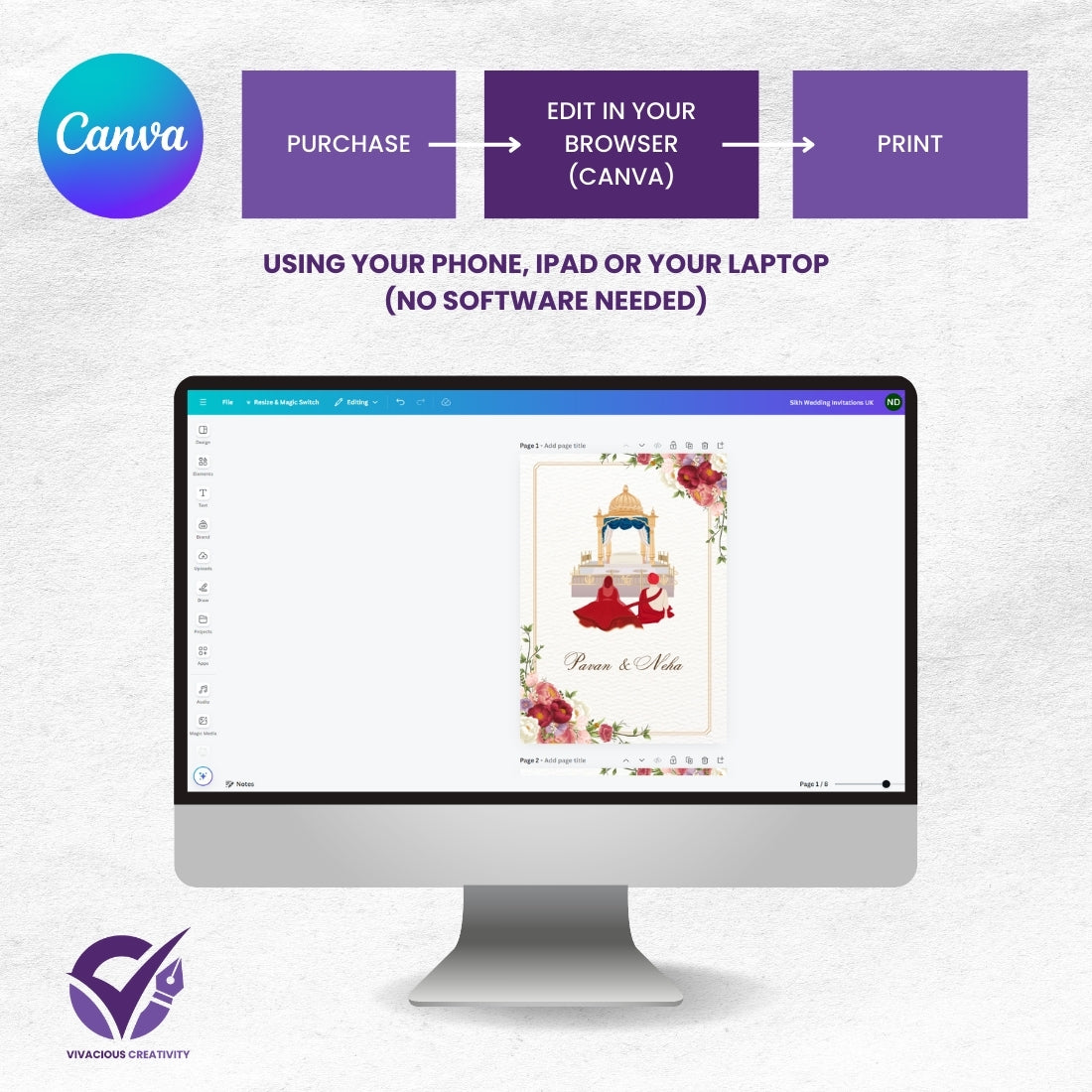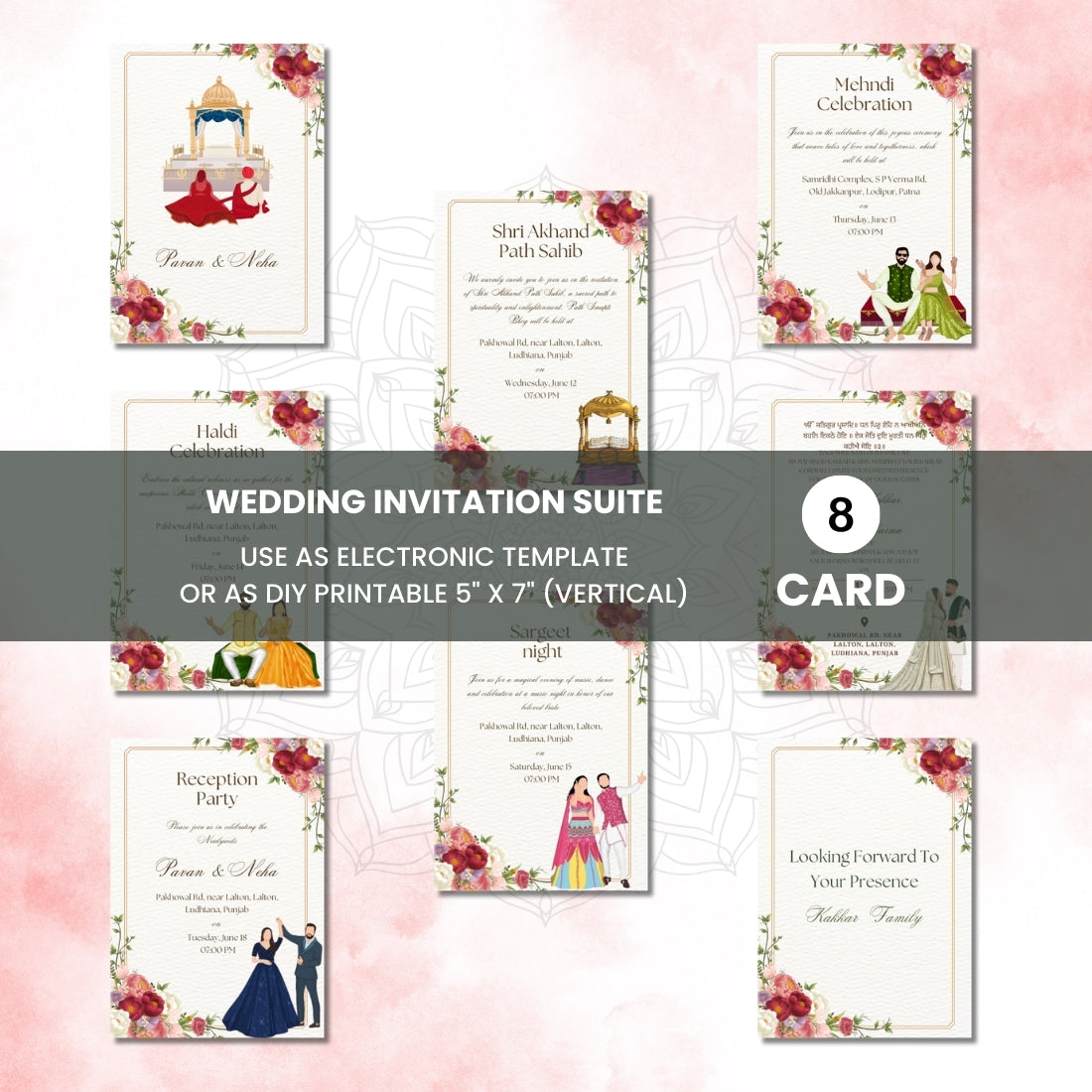 Sikh Wedding Invitations UK – 8 Card Digital Suite with Illustrated Designs (Editable in Canva)